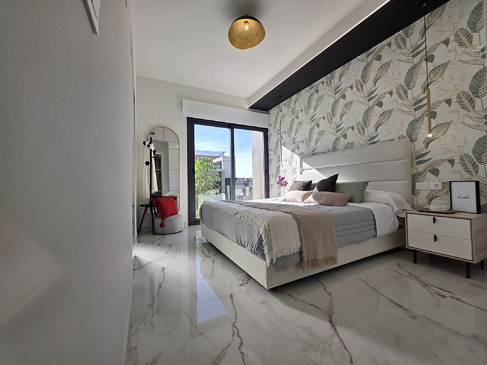 Tre stora sovrum med inbyggda garderober och två badrum, varav ett är en-suite till huvud sovrummet. Villan har ett bra ljusinsläpp från dom stora fönstren och terrass dörrarna. Takterrassen når man från utsidan och under trappen finns även ett förrådsutrymme!