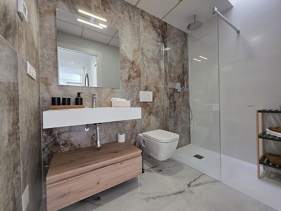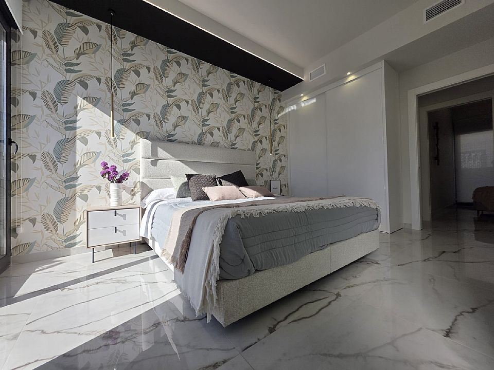 Tre stora sovrum med inbyggda garderober och två badrum, varav ett är en-suite till huvud sovrummet. Villan har ett bra ljusinsläpp från dom stora fönstren och terrass dörrarna. Takterrassen når man från utsidan och under trappen finns även ett förrådsutrymme!