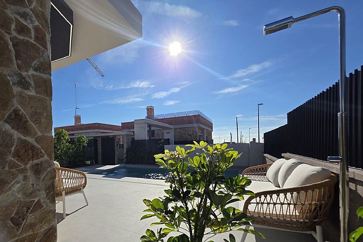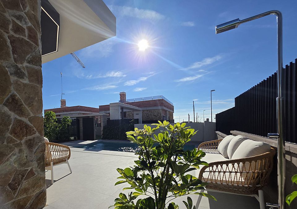 Här presenterar vi en av modellerna! Villan är på 107 kvm på ett plan med en privat pool stor terrass framför poolen, grönskande tomt och även en takterrass som har gott om plats för tex. solstolar grill eller kanske en jacuzzi!